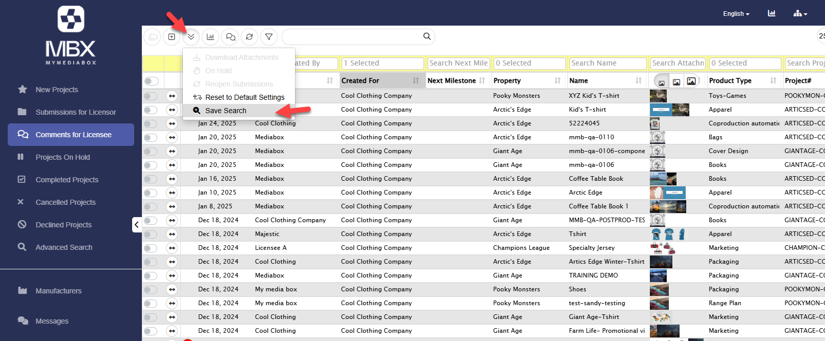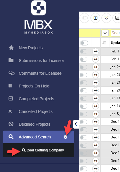 All folders can be searched easily by using Mediabox-PA’s filtering feature. If users are unsure which folder the project is in, the Advanced Search folder is the fastest way to search. Specific search filters may differ depending on the user’s role or Group assignment and the Project Status folder that is open.