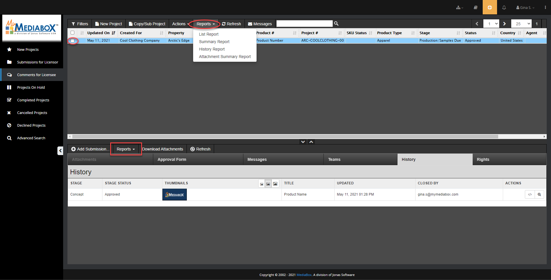 - At the top of the Project List pane, click the Reports dropdown menu and select a report.