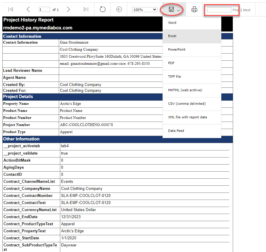 2. To export a report, click the disk icon and select a file format from the dropdown menu.